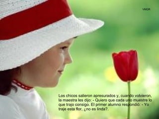 Una maestra le preguntó a sus alumnos qué es el amor. Les pidió que trajeran algo del patio de la escuela que representara el amor. Los niños trajeron una flor, una mariposa y un pichón. Una niña no trajo nada físico, explicando que no quiso arrancar la flor, aprisionar a la mariposa ni separar al pichón de su madre. La maestra elogió a esta niña por entender que el amor se lleva en el corazón, no se puede capturar.