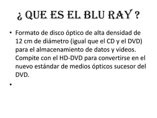 El Blu-ray es un formato de disco óptico de alta densidad de 12 cm que compite con el HD-DVD para ser el nuevo estándar sucesor del DVD, permitiendo almacenar una mayor cantidad de datos y videos de alta definición.