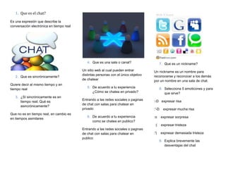 Este documento describe las características y ventajas del chat. Brevemente, el chat permite conversaciones en tiempo real, pero también puede exponer a usuarios a contenidos inadecuados y mal uso del lenguaje. Sin embargo, el chat también puede mejorar habilidades cognitivas y el acceso a la información cuando se usa apropiadamente.