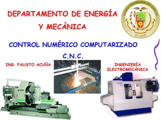 El documento describe el Control Numérico Computarizado (CNC), un método para controlar los movimientos de maquinaria como tornos, fresadoras y cortadoras mediante una computadora. El CNC permite movimientos complejos como círculos y figuras tridimensionales de manera automática una vez programada la máquina. El proceso involucra dibujar el proyecto usando CAD, programar la ruta de corte usando CAM, e implementarla en la maquinaria controlada por una unidad central. Se proveen tres ejemplos de proyectos de grado rel