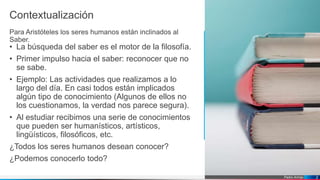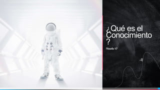 El documento define el conocimiento y distingue entre diferentes tipos y grados de conocimiento. Explica que la gnoseología estudia el conocimiento y que este requiere de un sujeto y un objeto. Además, distingue entre opinión, creencia y saber como grados de conocimiento, siendo el saber aquel que puede justificarse tanto subjetiva como objetivamente.
