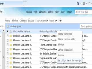 El documento explica cómo crear una cuenta de correo electrónico y enviar y recibir mensajes. Primero, se describe qué es el correo electrónico y para qué sirve. Luego, se enumeran los pasos para crear una cuenta de Hotmail, incluyendo elegir un nombre de usuario y contraseña, y proporcionar información personal. Finalmente, se explica cómo revisar los mensajes recibidos y cómo enviar un nuevo mensaje.