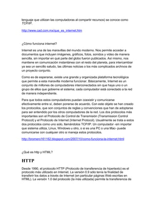 La creación de Internet comenzó en la década de 1960 cuando la DARPA y Rand Corporation desarrollaron una red descentralizada basada en conmutación de paquetes para compartir información de manera más efectiva. En la década de 1970, se creó el correo electrónico y más instituciones se conectaron a ARPANET. En 1982, ARPANET adoptó el protocolo TCP/IP como estándar, lo que marcó el nacimiento de Internet tal como la conocemos hoy.