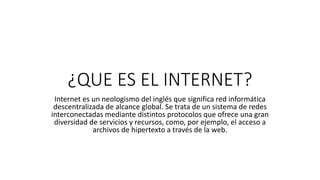 Internet es una red informática global descentralizada que interconecta redes a través de protocolos. Ofrece una gran variedad de servicios y recursos como la web, facilitando el acceso a información de todo tipo de forma inmediata y global. Se ha convertido en un medio cotidiano que utilizamos para comunicarnos y realizar diversas actividades como comprar productos o leer noticias de cualquier parte del mundo. Las páginas web son documentos electrónicos que contienen información en formatos como HTML y que proporcionan acceso a otros recursos a través de hiperenlaces
