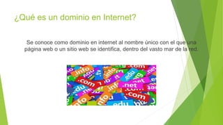 Internet es una red mundial de computadoras interconectadas que permite compartir información. Un dominio identifica de manera única a un sitio web, mientras que los motores de búsqueda indexan la información en internet y la proveen a los usuarios al ingresar palabras clave. Los navegadores como Chrome, Firefox y Safari permiten acceder y navegar sitios web.