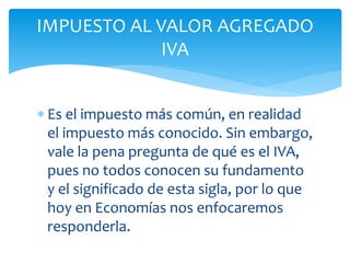 El documento analiza la importancia del Impuesto al Valor Agregado (IVA) como una fuente clave de ingresos para los estados y su impacto en la economía y la vida cotidiana. Se exploran las características del IVA, su aplicación, y los diferentes regímenes fiscales que rigen su cobro en Colombia, incluyendo el régimen simplificado y el común. También se discuten los desafíos de la evasión fiscal asociada a este impuesto y las consecuencias de su regulación.