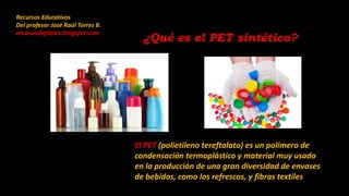 El PET (polietileno tereftalato) es un polímero ampliamente utilizado en envases de bebidas y fibras textiles, caracterizado por ser resistente, ligero y reciclable. Su uso en productos alimentarios está aprobado debido a sus propiedades físicas y capacidad de cumplir especificaciones técnicas. Sin embargo, su disposición final plantea problemas ambientales significativos, ya que puede acumularse en ecosistemas y causar obstrucciones en corrientes de agua.