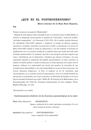 El documento resume los principales rasgos del posmodernismo. En pocas oraciones, explica que el posmodernismo surge como una crítica a la Ilustración y al proyecto moderno, cuestionando la razón universal y los metarrelatos. Se caracteriza por el escepticismo, el relativismo de valores, el presentismo y el énfasis en las pequeñas narrativas locales en lugar de grandes teorías.