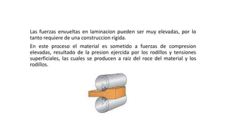 El laminado es un proceso de deformación que reduce el espesor de un material mediante fuerzas de compresión aplicadas por rodillos. Puede realizarse en caliente o en frío para dar forma a láminas, perfiles o productos con secciones transversales complejas. El laminado es fundamental en la industria del acero y otros metales y permite obtener productos con mejores propiedades mecánicas.