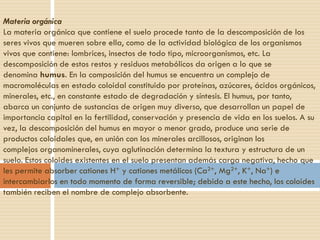 El documento describe lo que es el suelo y su importancia. Explica que el suelo es renovable pero no inagotable, y que contiene minerales indispensables para la vida. Además, contiene materia orgánica procedente de la descomposición de seres vivos, la cual forma humus rico en nutrientes. Finalmente, varios experimentos muestran la presencia de agua, gases y minerales en el suelo.