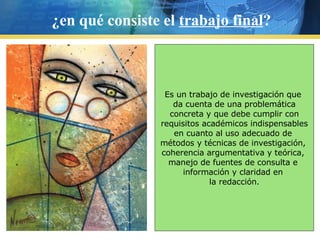 El documento describe los requisitos y características del trabajo final que deben completar los estudiantes. Explica que el trabajo final implica investigar un problema concreto usando métodos científicos como indagar y examinar cuidadosamente la información. Su propósito es integrar los conocimientos y habilidades de los estudiantes a través de resolver un problema bajo su responsabilidad. El documento también identifica algunos obstáculos comunes como falta de tiempo, fuentes de información o creatividad por parte del estudiante.