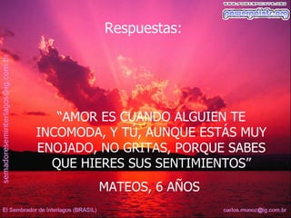 Los niños definieron el amor de diferentes formas basadas en sus propias experiencias, como cuando alguien se preocupa por los sentimientos de otra persona a pesar de estar enojado, ayudar a un familiar enfermo a pesar de tener la misma enfermedad, compartir comida con alguien sin esperar nada a cambio, y permanecer apoyando a alguien incluso después de conocer sus defectos.