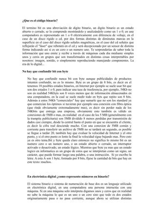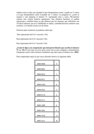El documento explica los conceptos básicos de código binario, bytes y representación de números en binario. El código binario representa información como unos y ceros, donde un byte consta de 8 bits. Los números se representan en binario agrupando unos y ceros, por ejemplo 3 se representa como 0010. El documento también describe las unidades para medir capacidad, velocidad de procesamiento y transmisión de datos en computadoras.