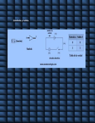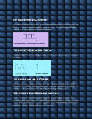 El documento explica las diferencias entre electrónica digital y analógica, así como conceptos relacionados como variables binarias y compuertas lógicas. La electrónica digital solo puede tomar dos valores fijos de corriente o tensión (0 o 1), mientras que la electrónica analógica varía de forma continua. Una variable binaria también solo puede tomar dos valores distintos. Las compuertas lógicas son componentes electrónicos con una o más entradas y una salida que toma valores en función de las entradas, representando operaciones lógicas median