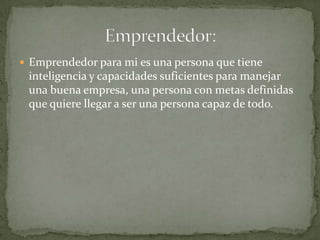 Un emprendedor es una persona inteligente y capaz de manejar una empresa exitosa, con metas claras para lograr todo lo que se proponga.