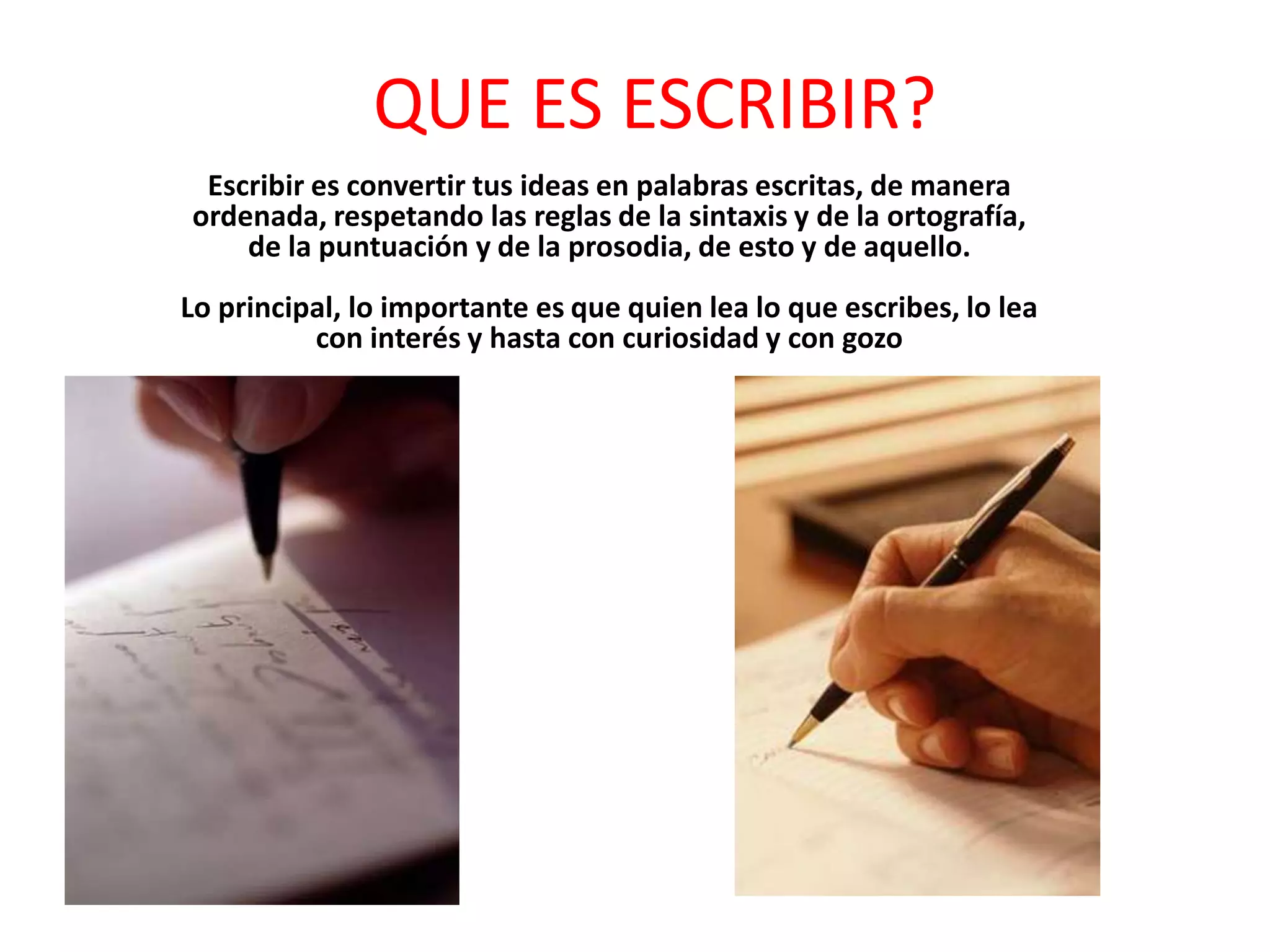 Escribir es convertir ideas en palabras escritas de manera ordenada y respetando las reglas de sintaxis, ortografía y puntuación. Lo más importante es que quien lea lo escrito lo haga con interés, curiosidad y disfrute.