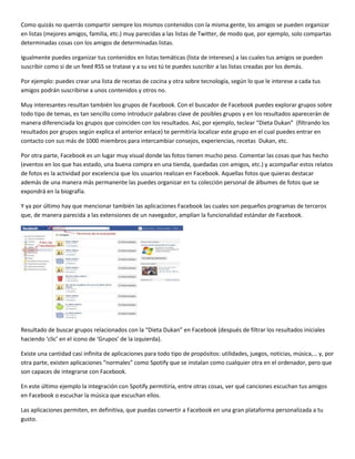 Este documento describe las características principales de Facebook y su funcionamiento. Facebook es la red social más grande del mundo con más de 900 millones de usuarios. Permite a los usuarios conectarse con amigos y familiares, compartir fotos y enlaces, y organizar sus contactos en listas. También ofrece grupos sobre diversos temas y aplicaciones que amplían su funcionalidad. Facebook ha crecido exponencialmente y se ha convertido en una importante herramienta tanto personal como profesional.