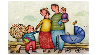 La familia ha evolucionado a lo largo de la historia desde grupos primitivos como la horda hasta la familia nuclear moderna. Los vínculos de parentesco se han dado tradicionalmente a través de lazos consanguíneos, de afinidad o adopción. Existen diversos tipos de familias como la nuclear, monoparental o extendida, cada una con sus características. La familia pasa por diferentes etapas a lo largo del ciclo vital de sus miembros.