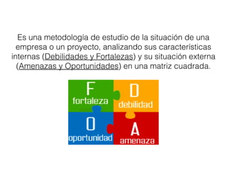 Este documento describe el análisis FODA, una metodología para estudiar la situación interna y externa de una empresa u organización. El análisis FODA evalúa las Fortalezas, Oportunidades, Debilidades y Amenazas de una entidad, y puede usarse para desarrollar una estrategia futura. El documento proporciona ejemplos de cada una de estas categorías y explica cómo aprovechar las fortalezas y oportunidades y defenderse de las debilidades y amenazas.
