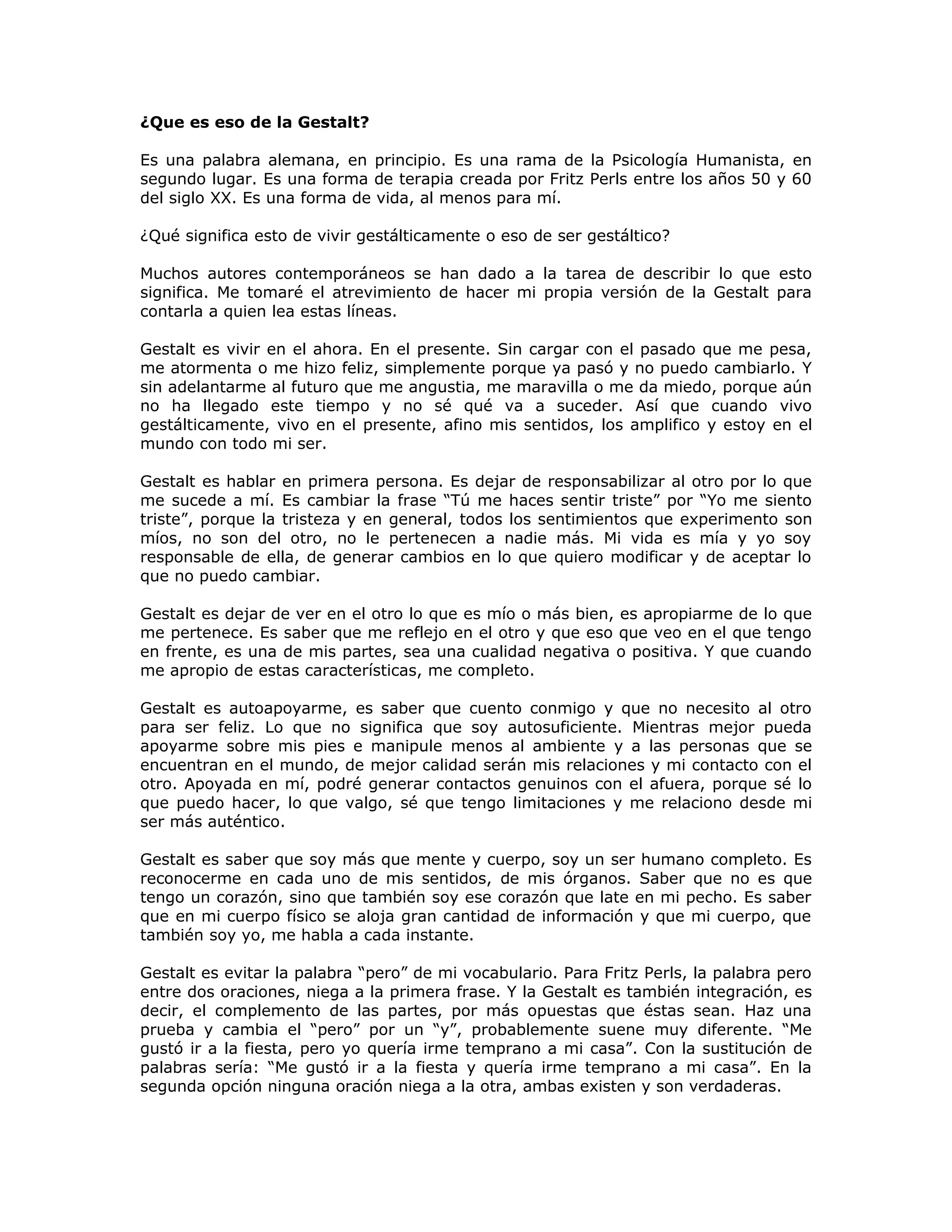 La Gestalt es una forma de terapia creada por Fritz Perls en los años 1950-1960 que se centra en vivir en el presente, asumiendo la responsabilidad personal por los propios sentimientos, y reconociendo que uno es más que solo cuerpo y mente. La Gestalt promueve la integración de todas las partes de uno mismo, la congruencia entre pensamientos y acciones, y un enfoque flexible y en constante crecimiento.