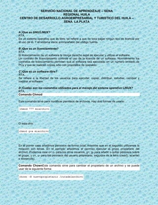 Este documento presenta una serie de preguntas y respuestas sobre el sistema operativo Linux. Explica qué es GNU/Linux, qué es un licenciamiento de software, qué es un software libre, y enumera y describe varios comandos importantes utilizados en Linux como chmod, chown, chgrp, du, grep, head, kill, locate, ls, man, tail, ps, top y uptime. También incluye un cuadro comparativo de comandos de Windows y Linux y describe las características generales de Linux como su código abierto, desarrollo colaborativo