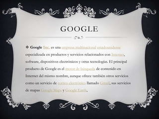 Google Inc. es una empresa multinacional estadounidense que ofrece productos y servicios relacionados con Internet como su motor de búsqueda principal, Gmail, Google Maps y Google Earth. Algunos de sus principales servicios de búsqueda incluyen el buscador de Google, Google Grupos que provee acceso a foros Usenet, y Google Noticias que recopila noticias de forma automatizada de más de 700 fuentes en más de 20 idiomas con actualizaciones cada 15 minutos.
