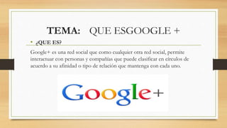 Google+ es una red social que permite a los usuarios interactuar y compartir con otras personas y compañías agrupadas en círculos según su afinidad. Los usuarios se convierten automáticamente en miembros de Google+ al crear una cuenta de Gmail y luego pueden comenzar a agregar amigos a sus listas de contactos o buscarlos directamente. Los círculos permiten organizar amigos de acuerdo a los intereses del usuario.