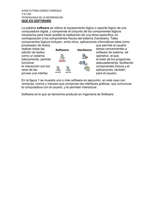 El hardware se refiere a las partes físicas y tangibles de una computadora como sus componentes eléctricos, electrónicos y mecánicos, cables, gabinetes y periféricos. El software se refiere al equipamiento lógico necesario para realizar tareas específicas como sistemas operativos y aplicaciones. El hardware se ha clasificado en tres generaciones definidas por cambios tecnológicos mientras que el software incluye aplicaciones y sistemas operativos que permiten la interacción entre hardware y usuario.