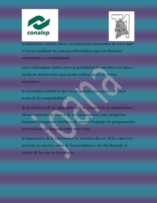 La informática se refiere al tratamiento automático de datos mediante sistemas informáticos como ordenadores o computadoras. Estos sistemas deben poder introducir datos e instrucciones para realizar tareas de forma automática. La informática estudia lo que los programas pueden hacer, como la eficiencia de los algoritmos y la organización de datos.
