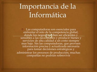La informática es la ciencia que estudia el tratamiento automático y racional de la información a través de programas en máquinas. Las computadoras son esenciales para las empresas en la era de la competencia global al proporcionar información precisa y actualizada necesaria para tomar decisiones estratégicas y administrar procesos de producción de manera eficiente. Además, las computadoras ayudan a la comunicación entre personas y son fundamentales para que industrias manejen la gran cantidad de información con la que operan.