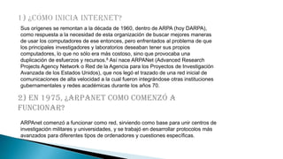 El documento describe el origen de ARPANET en la década de 1960 como una red creada por ARPA (ahora DARPA) para unir centros de investigación militares y universidades. ARPANET evolucionó para funcionar como base de una red más amplia y desarrollar protocolos avanzados para diferentes tipos de ordenadores.