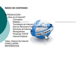 El documento describe brevemente la historia e introducción de Internet. Comenzó en la década de 1960 como una red académica y gubernamental llamada ARPANET. En la década de 1990, con la introducción del World Wide Web y navegadores, Internet se hizo accesible al público general y su uso se expandió rápidamente. Actualmente, Internet conecta millones de redes y computadoras alrededor del mundo a través de protocolos como TCP/IP.
