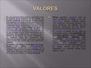 El documento trata sobre la axiología, ética, moral y anomia. La axiología analiza los valores positivos y negativos así como los principios que determinan si algo es valioso. La ética y estética aplican el concepto de valor. La anomia se refiere a la falta de normas sociales que guíen el comportamiento de los individuos.