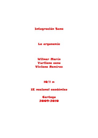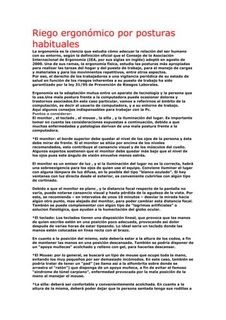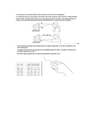El documento habla sobre la ergonomía y los riesgos para la salud asociados con malas posturas al usar computadoras. Explica que la ergonomía estudia la relación entre humanos y su entorno de trabajo. Describe posibles problemas de visión, cuello, hombros, espalda y manos que pueden resultar de malas posturas. También menciona el síndrome del túnel carpiano y ejercicios para prevenir lesiones.
