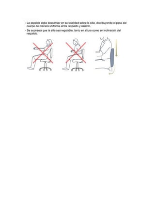El documento habla sobre la ergonomía y los riesgos para la salud asociados con malas posturas al usar computadoras. Explica que la ergonomía estudia la relación entre humanos y su entorno de trabajo. Describe posibles problemas de visión, cuello, hombros, espalda y manos que pueden resultar de malas posturas. También menciona el síndrome del túnel carpiano y ejercicios para prevenir lesiones.