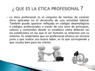La ética se refiere a la reflexión sobre lo correcto e incorrecto y al perfeccionamiento personal a través de decisiones libres. La ética profesional incluye normas aplicadas en el trabajo para ofrecer un servicio justo. Los códigos deontológicos establecen principios y valores para las relaciones laborales y proyectan una imagen de profesionalidad ante la sociedad. La ética de la ingeniería examina las obligaciones de los ingenieros con la sociedad, clientes y organización.