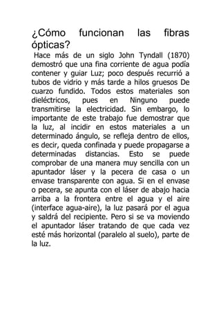 La fibra óptica es un fino hilo de vidrio o plástico transparente que transmite pulsos de luz para representar datos. Se usa ampliamente en telecomunicaciones debido a que permite enviar grandes cantidades de datos a largas distancias a velocidades similares a la radio. Funciona confinando un haz de luz dentro de la fibra a través de la reflexión total interna, lo que permite que la luz se propague a lo largo de la fibra.