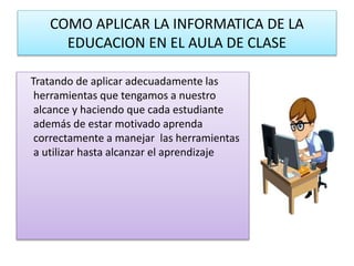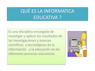 La informática educativa investiga y aplica los avances científicos y tecnológicos de la información y la educación en los procesos educativos. Aplica adecuadamente herramientas como computadoras para motivar a los estudiantes y asegurar que aprendan correctamente, permitiendo flexibilidad en los intereses de los estudiantes.