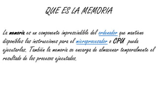 El documento describe los diferentes tipos de memoria RAM que se han utilizado a lo largo de la historia. Explica que la memoria RAM almacena temporalmente instrucciones y datos para que el procesador pueda ejecutarlos de forma aleatoria. Luego resume los primeros tipos de memoria RAM de núcleo magnético y relés, y describe varios tipos posteriores como la FPM-RAM, BEDO-RAM, EDO-RAM y sus mejoras en velocidad de acceso.