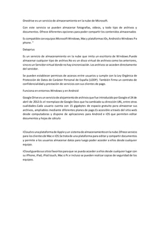 La nube permite ofrecer servicios de computación a través de una red, usualmente Internet. Proporciona ventajas como implementación rápida, actualizaciones automáticas y servicios a nivel mundial, pero también desventajas como dependencia de proveedores y disponibilidad sujeta a acceso a Internet. Existen recursos como Dropbox, OneDrive y Google Drive para compartir archivos en la nube.