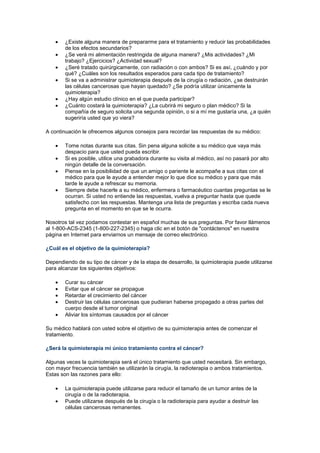 La quimioterapia se puede administrar de varias maneras, incluyendo intravenosamente a través de un catéter o un dispositivo implantado, por vía oral, o directamente en el área del tumor. La frecuencia y duración del tratamiento dependen del tipo y etapa del cáncer, y pueden incluir ciclos con períodos de descanso. Además de la quimioterapia, es posible que se requieran cirugía y/o radioterapia para tratar completamente el cáncer.