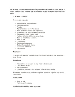 La ética estudia la moral y la conducta humanas. Se originó en la antigua Grecia con filósofos como Platón y Aristóteles, y ha sido tratada por otros como Kant. La moral son las normas que guían el comportamiento individual y social para distinguir entre lo bueno y lo malo. El ser humano es multidimensional con cuerpo, alma y espíritu, y requiere satisfacer necesidades en diferentes dimensiones para desarrollarse de manera integral.