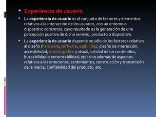 El documento habla sobre la experiencia de usuario y factores relacionados como el diseño, usabilidad y emociones. También discute la interacción entre personas y ordenadores (HCI) y cómo el diseño debe enfocarse en hacer que los sitios web sean eficientes, efectivos y satisfactorios de usar. Explica diez principios clave para el diseño de experiencia de usuario como la claridad de propósito, visibilidad, lógica, control del usuario, prevención de errores y efectividad de mensajes.