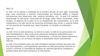 La Web 1.0 se caracterizó por contenidos estáticos y unidireccionales que rara vez se actualizaban. La Web 2.0 introdujo blogs, wikis, redes sociales y otras herramientas que permitieron la creación y compartición colaborativa de contenidos. La Web 3.0 es la web semántica basada en la nube que se accede a través de diversos dispositivos y pretende ofrecer servicios inteligentes al usuario.