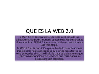 La Web 2.0 representa la evolución de las aplicaciones tradicionales a aplicaciones enfocadas en el usuario final que funcionan a través de Internet y permiten la colaboración. Se trata de aplicaciones como redes sociales, wikis y blogs donde los usuarios interactúan y comparten contenido en lugar de solo observar pasivamente. Aunque no implica actualizaciones técnicas, la Web 2.0 difiere de las tecnologías anteriores en su enfoque en el usuario y la colaboración.