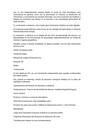 La Web 2.0 se refiere a aplicaciones web que facilitan el compartir información y la colaboración entre usuarios para crear contenido. Esto incluye comunidades web, redes sociales, blogs y wikis. Aunque sugiere una nueva versión de la web, realmente se refiere a cambios en cómo los desarrolladores y usuarios usan la web de forma interactiva y colaborativa. La Web 2.0 puede aplicarse positivamente a la educación en línea al proveer experiencias más interactivas y enriquecedoras para estudiantes y profes