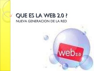 La Web 2.0 es una nueva generación de Internet que permite a los usuarios construir contenido juntos de manera activa y colaborativa. Surge en 2005 y se caracteriza por aplicaciones y servicios que facilitan la comunicación y el aprendizaje a través de redes, donde la información la generan los propios usuarios. Esto ha supuesto un cambio en cómo las personas se comunican y aprenden de forma más interactiva.
