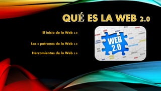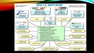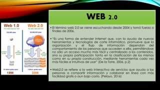 Este documento describe la evolución de la Web 2.0, incluyendo sus orígenes, los 8 patrones clave (como inteligencia colectiva y datos como elemento central), herramientas como blogs, wikis, etiquetado social, redes sociales y almacenamiento en la nube. También hace referencia al concepto emergente de Web 3.0 como una web semántica con contenidos mejor definidos y accesibles a través de múltiples aplicaciones.