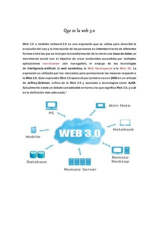 La Web 3.0 se refiere a la evolución de Internet hacia una base de datos global accesible a través de múltiples aplicaciones, impulsada por tecnologías como la inteligencia artificial, la web semántica y la realidad virtual. Incluye la transformación de la web en una "Data Web" donde los datos estructurados son accesibles a través de formatos como RDF, y el desarrollo de sistemas inteligentes que extraen información y realizan predicciones a partir de los datos disponibles en la red. Existe debate sobre si la Web 3.