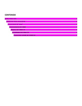 La Web es un sistema de distribución de documentos interconectados accesibles a través de Internet. Se desarrolló en 1989 por Tim Berners-Lee y se publicó en 1992. La Web 1.0 era estática y de solo lectura, mientras que la Web 2.0 permite la interacción y colaboración entre usuarios. Se espera que la Web 3.0 incorpore inteligencia artificial y semántica para hacer la información más accesible a las máquinas.